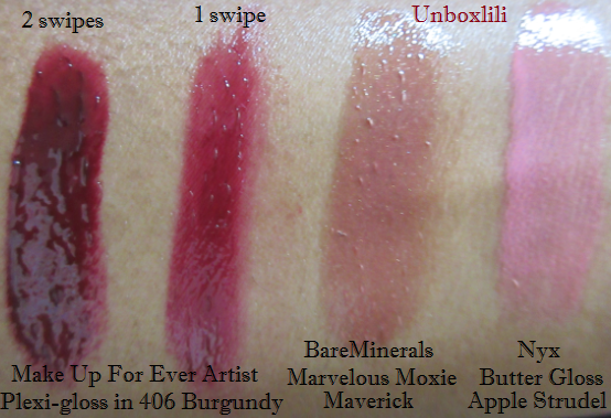 Make Up For Ever Artist Plexi-gloss in 406 Burgundy is a shade I talk about frequently. As demonstrated in swatches further above, the shade and intensity is dependent on how much product is applied. It is an opaque high-shine gloss which I can be seen wearing in several youtube videos, my current youtube channel photo, and my “About Me” photo here.