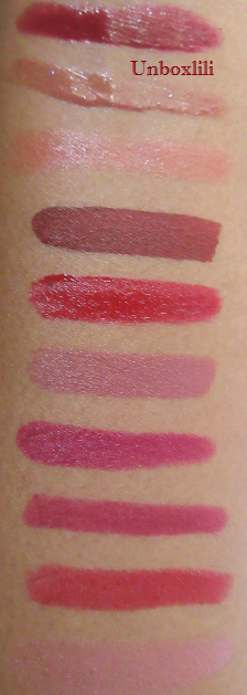 The majority of my glosses were gifts from friends or from subscription boxes. I can’t remember how I got the BareMinerals Marvelous Moxie Lip Gloss in Maverick. It’s a shade I never would have purchased for myself but I’m happy to have it. It’s a brownish pink gloss which looks lovely on my bare lips and on top of light pink lipsticks. In fact, whenever I get a lip product that is too light, I apply Maverick over it to see if it can become more wearable. My favorite glosses are swatched below.