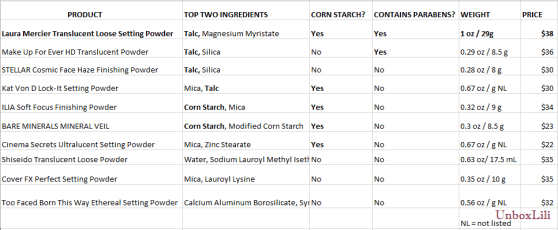 After making the chart, I’m even happier with the price since I’m getting 2-3 times more product for only a few dollars more. There is one other product I know about, but haven’t tried myself, which is a top seller among beauty lovers: The RCMA Translucent Powder. RCMA does list propylparaben as an ingredient and it may contain trace amounts of talc but $12 for 3 oz is an undisputed better deal.