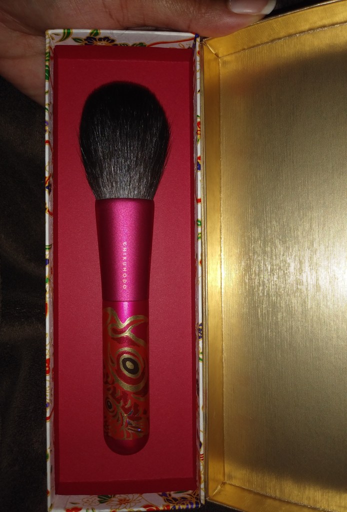I jokingly refer to this as the Rolls Royce of my brush collection. This brush was released at the end of April 2020 and is part of Chikuhodo’s Makie Series. It is described as a collaboration between Chikuhodo, the lacquerware brand Yamanaka-Shikki, and mural artist Hideki Kimura for his Koi design. The subtle sparkles in the paint on this brush were caused by the Maki-e process of powdered gold, silver, and/or other precious gems being dusted onto the design while the lacquer was still wet. The brush head looks huge because the bristles are extremely long while also being the standard width of a large powder brush. However, when turned, you can see that it has a flatter side. This is not a dense buffing type of brush. I find it’s more of a finishing brush to either sweep powder all over the face or dust away any excess powder.