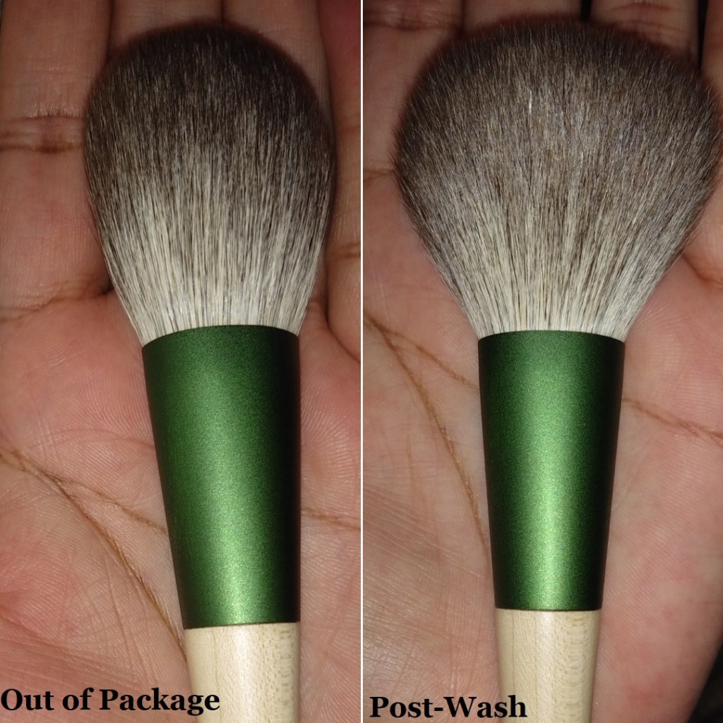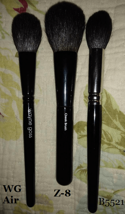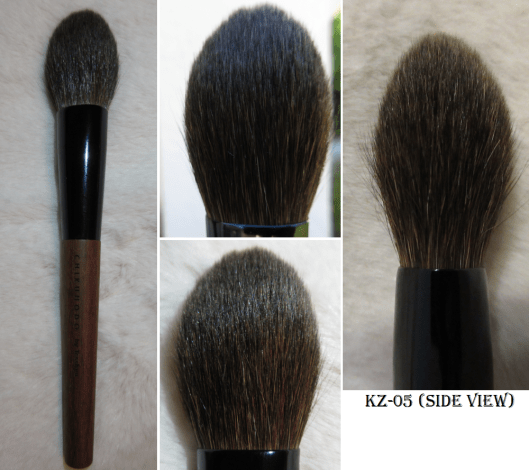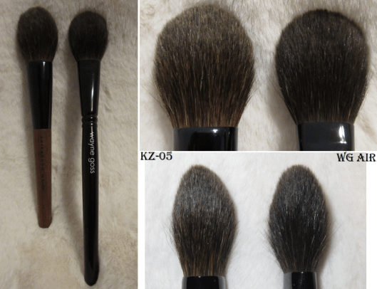 Upon first glance, the brush head size reminded me of the Wayne Goss Air Brush. That brush is made of blue squirrel for $35 versus Kazan squirrel for $90. The Air Brush is a few millimeters smaller in length and width, but when I squished the bristles, the Air Brush is about half as dense as the KZ-05. If the Air Brush was double the density and twice the price, that would still show the large price gap between the two squirrel hair types.