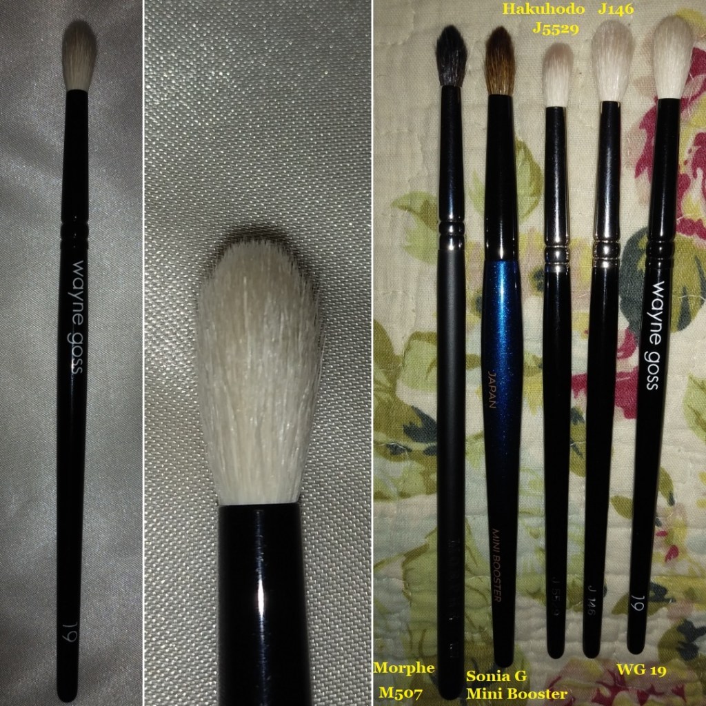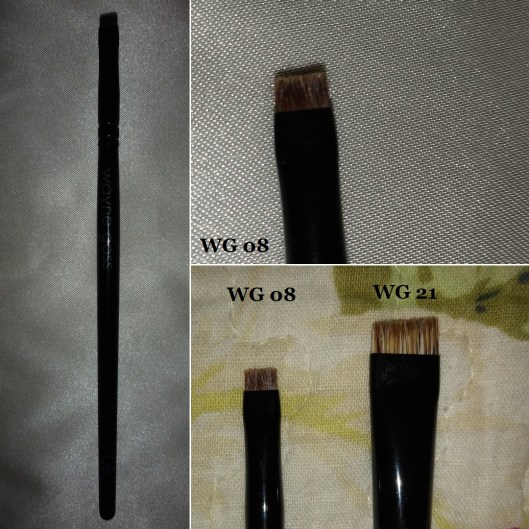 WG 21 Eyebrow Brush Out of the set, I get the most use out of this brush. It works very well, but it’s a bit bigger than I prefer. All my other angled brow/liner brushes are smaller, so I have to be careful using this. Also, water badger hair isn’t all that soft. Just forewarning, since natural hair brushes are usually associated with softness. This brush is stiff.