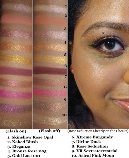 The only disappointment I have is the addition of both Bronze Rose 005 and Gold Lust 001 because the differences in those two shades aren’t distinct enough on my eyes. Considering how specific this color story already is, and being limited to ten shadows, I would have liked the gold eyeshadow (which she has plenty of across all her palettes) to be replaced with something else. Also, Eleganza and Divine Dusk look similar next to each other on my lids as well. Regardless, I’m still glad I bought this.