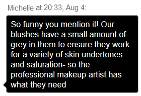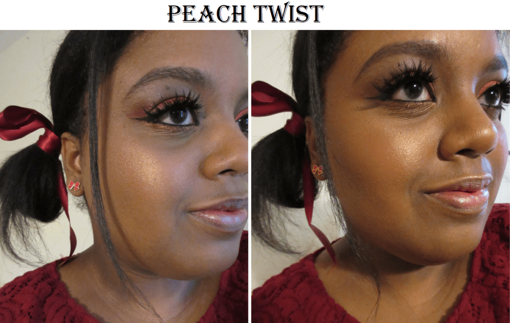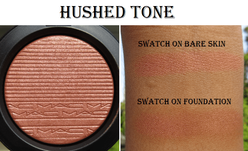Hushed Tone is extremely close to Peachtwist. I find it difficult to properly describe how the shades look similar but the effect is so different. Hushed Tone has more base pigment color whereas Peachtwist has a stronger sheen. The way the glitter reflects is a little different. Hushed Tone’s powder looks like a more refined shimmer and Peachtwist gives a stronger highlighted effect, though I would still call it shimmery, not glittery. For someone with a lighter complexion than mine, the color differences between the two will stand out more. As the shades look similar enough on me, if I had to choose one, it would come down to a preference of sheen. It isn’t subtle for either blush but Hushed Tone is a little more natural-looking because of those finer particles. However, I could not part with either one.