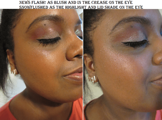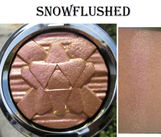 MAC had a gorgeous holiday eyeshadow called Stylishly Merry (version 2, not the original purple one) that I missed out on getting. So, when they released the Snowflushed highlighter the following year, it was the closest dupe I could find. It has a beautiful coral pink to gold shift in the pan but it is unfortunately too glittery for my taste as a highlighter. I wore it as a lid shade in the same photo, and the color shift doesn’t translate on my cheeks or eyes, so that’s a little disappointing. However, it still makes me happy to own for collector purposes.