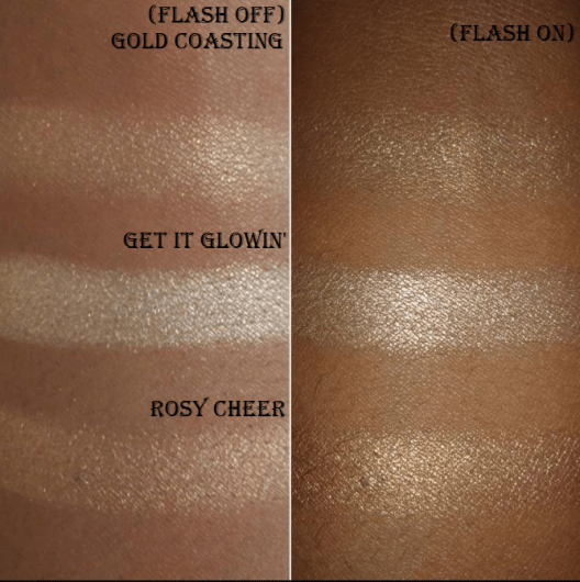 Although the golds in the Get it Glowin’ palette look distinctly different in swatches, I can’t tell the difference on my cheeks. In fact, spoiler alert, I can’t tell the difference among any of the gold highlighters in terms of the color. It just comes down to how smoothly they apply, how intense they can get, and how sparkly or fine the glitter particles are. Within this palette, I did notice the actual Get it Glowin’ shade was more subtle than the others, despite it being the iciest one that should have stood out the most against my skin tone. Out of the three shades, Rosy Cheer seemed the smoothest and most flattering on me.