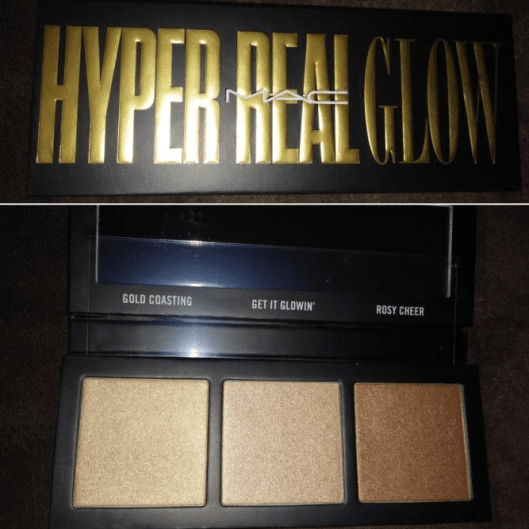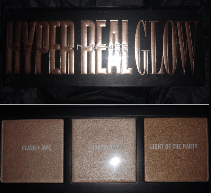 This is the Get it Glowin’ Hyper Real Glow Palette. This trio contains the highlighter shades Gold Coasting, Get It Glowin’, and Rosy Cheer. They are a bit on the golden side. MAC sells a pale pastel version (Get Lit), peach version (Shimmy Peach), and pink version (Flash + Awe). I currently own the latter and will include a photo, but I don’t have swatches as I intend to give this away or sell it.