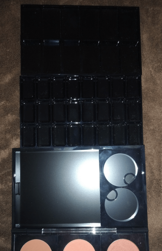 The top 12-well in the picture is the larger insert for creams, gels, lipsticks, etc. Below that is the 24-well smaller insert. Lastly is a two-blush insert inside my MAC double-sided palette. Each side holds three blush inserts for a maximum of six blushes per side. I have one double-sided palette that currently holds MAC blushes. The other I turned into a regular magnetic palette to hold other brands’ products by placing magnetic sheets inside. Some people don’t know this, so I think it’s very important to state that MAC refill products only stick properly to MAC palettes because the refills all have magnets attached to the bottoms of them.