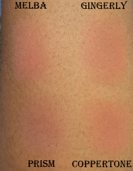 From what I can tell, Melba is pinker, Gingerly is a little more orange, Prism has more brown, and Coppertone is redder. But Gingerly, Coppertone, and Prism look virtually identical on my cheeks.