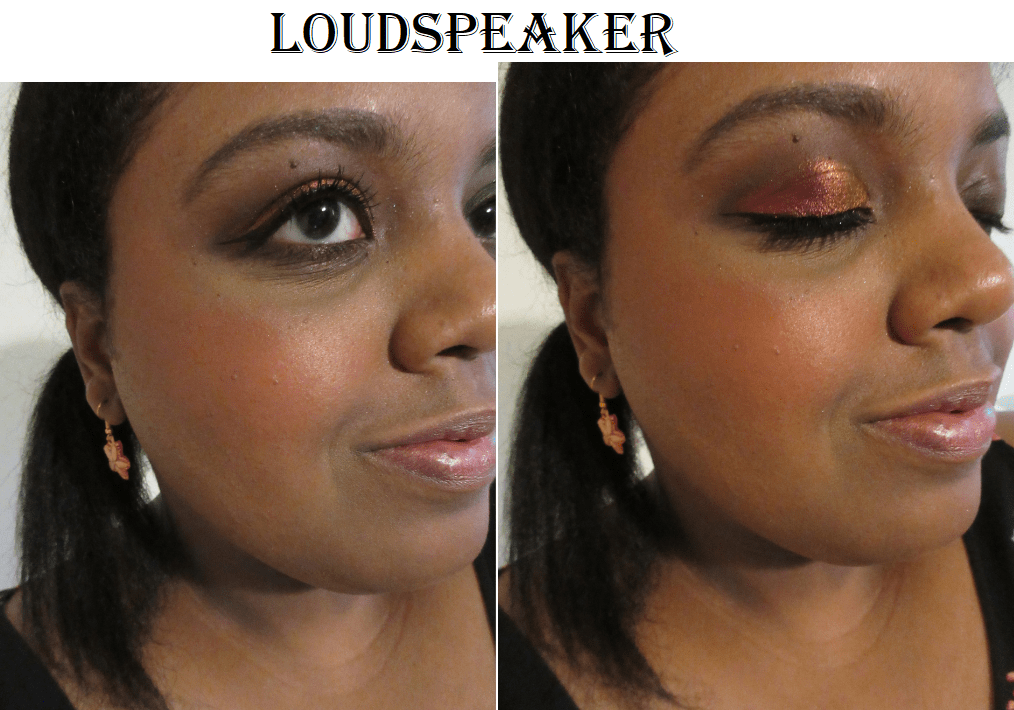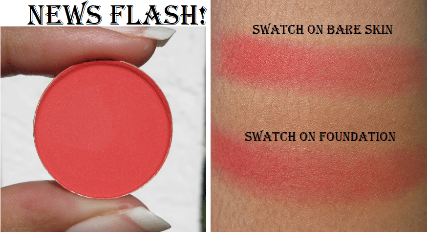 News Flash! comes up as a matte in the search bar, but is referred to as a “red-orange with pearl.” I can’t see any shimmer in the pan or swatches, so the matte description is more accurate. I double-checked to ensure I read the website correctly, as I think the Loudspeaker and News Flash descriptions are reversed. News Flash seems more orange-coral to me with Loudspeaker being red-orange with visible shimmer specks in the pan.