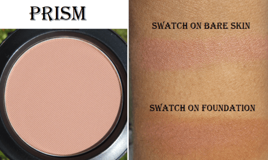 Coppertone is a matte peach brown and another shade I’d assume wouldn’t work for me due to the color in the pan. Just like the previous blush, this leaves a very subtle flush as the brown blends into my foundation but the peachiness pokes through just enough to look natural and beautiful. The pigmentation level makes it easier to build up than the other more natural blushes. Melba and Prism are intended for light to medium skintones, whereas Coppertone is probably best for medium and up. I spoke with a MAC representative via live chat who said “Our blushes have a small amount of grey in them to ensure they work for a variety of skin undertones and saturation.” I was always under the impression that white or grey additions to blushes is what makes them ashy, but I’m just the messenger! I don’t know how MAC does it, but their range is phenomenal.