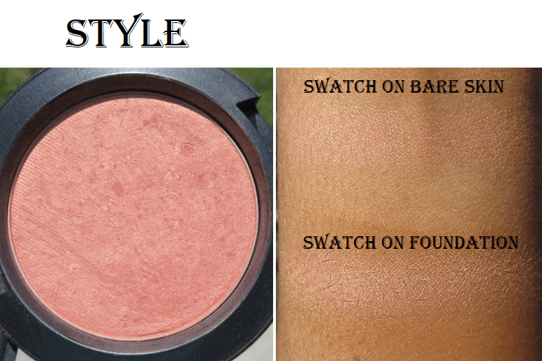 Style is a coral-peach with gold pearl and a frost finish. I consider this shade the shimmer version of Melba. Although it also works as a beautiful highlighter or blush topper, I’ve never worn this alone as just blush in public. It’s definitely not made for my skin tone, but I’m drawn to it anyway.