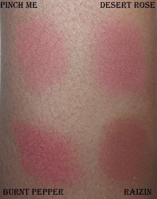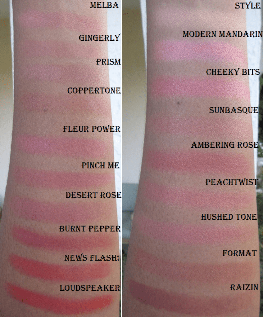 BLUSHES: Hushed Tone, Coppertone, Peachtwist, Burnt Pepper, Pinch Me, and Format. I would be tempted to, but probably not immediately repurchase Melba, Desert Rose, Fleur Power, and Cheeky Bits. The blush Style is so beautiful that I would probably repurchase it for blush topper/ highlighter purposes.