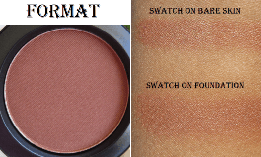 Format is described as a pinkish brown, but I can see golden pearl on my cheeks from this frost finish blush. This blush is only available in the compact form. It reminds me a lot of the Coconut shade in the ELF Bite-Size Face Duos recently released (which I intend to review next month). I would consider this to be a much darker shimmery version of Coppertone.