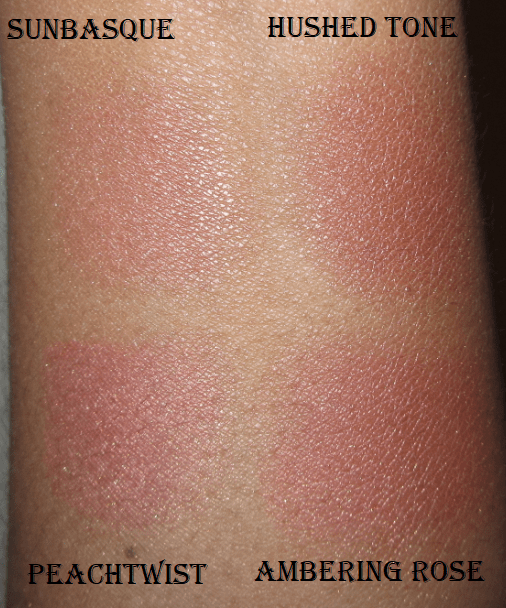The Sheertone Shimmers are from lightest to darkest: Sunbasque, Peachtwist, and Ambering Rose. The differences are barely detectable while looking at the pans (particularly between Peachtwist and Ambering Rose), but on the cheeks, it goes from too light, then perfect, to too dark.