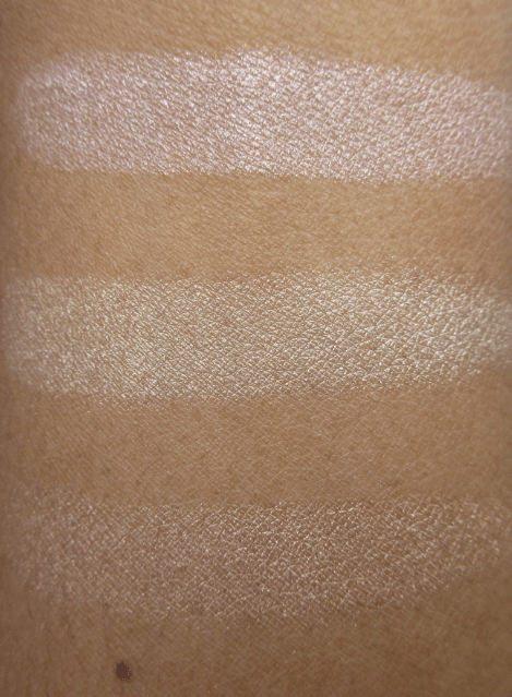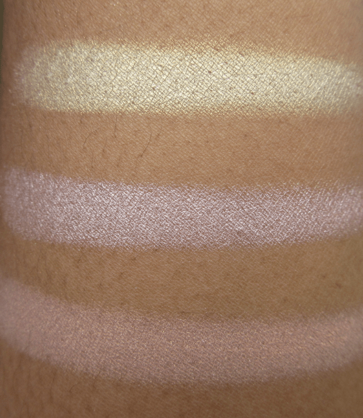 The visible sheen on the surface of Hourglass and Guerlain’s trio powders are unlike any other highlighters I own. This is probably due to the addition of pearl powder which both brands cite as the main contributor to the beauty of these highlighters. Even though a sheer base, in theory, seems like the Hourglass powders would look better on my skin, the micro pearl particles are whitish, which doesn’t look as complimentary to someone like me with a yellow undertone and dark skin. The base pigment in the Guerlain highlighters help match me better, with the exception of the pink one.