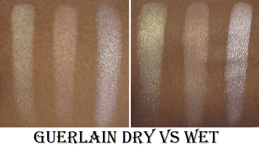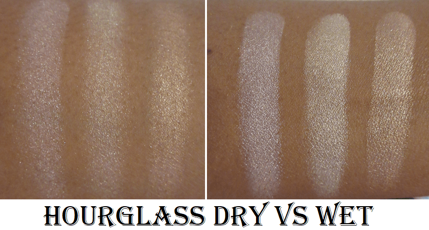 The Hourglass powders have a sheer base to them, which is why they appear sheerer in swatches than the ones from Guerlain. However, the Hourglass powders are much more reflective, as can be seen when applied to my cheeks. So, they end up making a bigger impact with my usual application method. They are meant to be used wet for more intensity (with a spray or primer) or dry. When I apply them dry, they’re at my maximum shimmer comfort level (unless I use a light hand and blend them very well), so I don’t use them wet. The Guerlain ones can also be applied wet too, but the difference is minimal compared to the jump in intensity when the Hourglass powders are used wet.