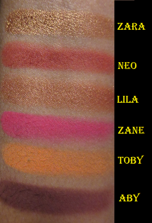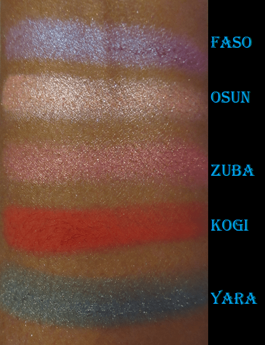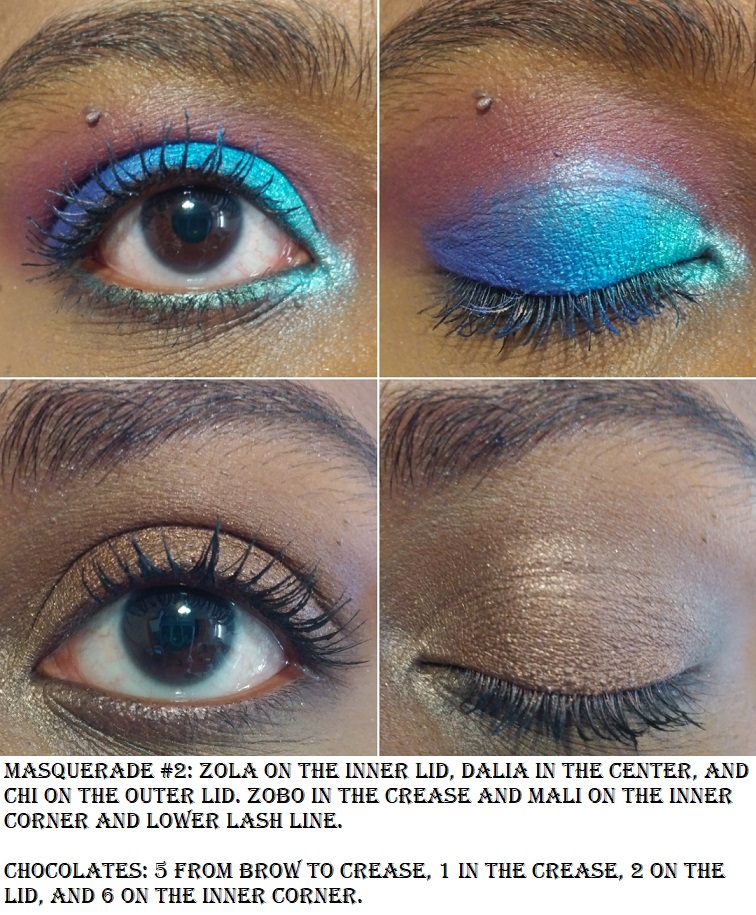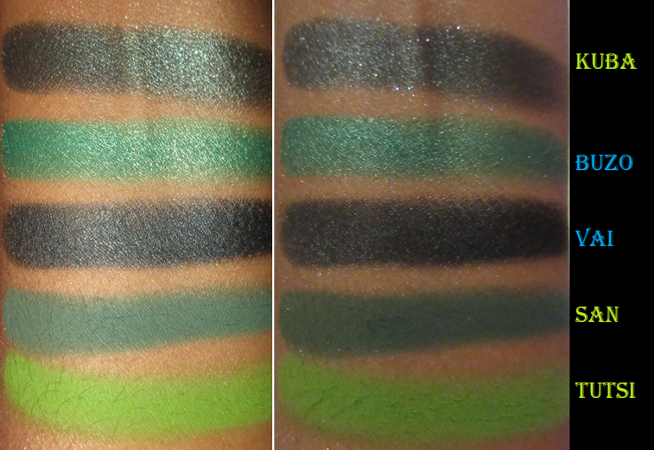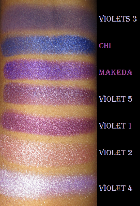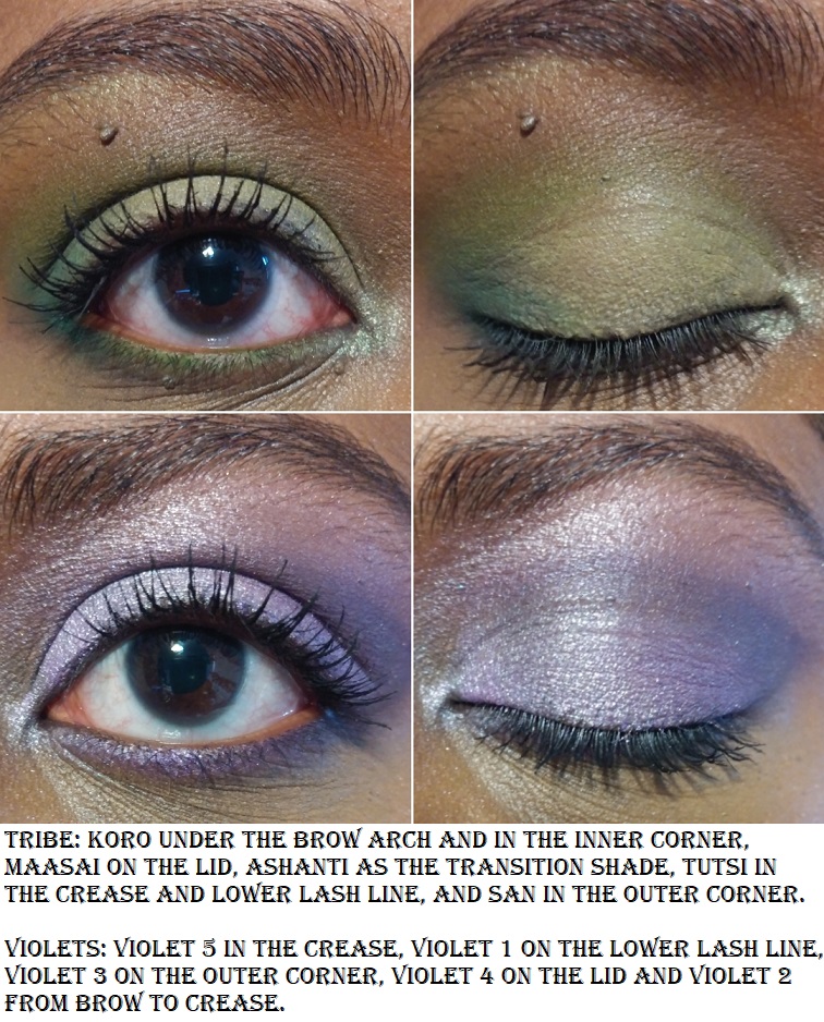 The shade names in green are from the Tribe palette, which has been discontinued. Blue is for the Magic palette, Purple for Masquerade, and lilac purple for the Violets.