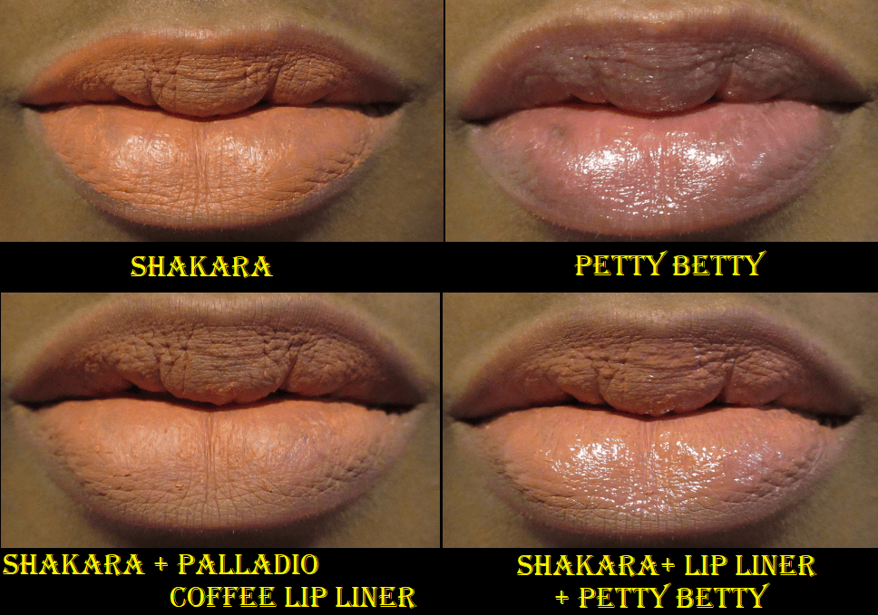 Shakara is a gorgeous color, but right on the cusp of being too pale for my preference. Using a lip liner is enough to make Shakara wearable for me, but my favorite combination is pairing it with a lipliner and gloss. Petty Betty isn’t the kind of pink I normally gravitate towards, but it pairs well with Shakara and is still nice on its own.