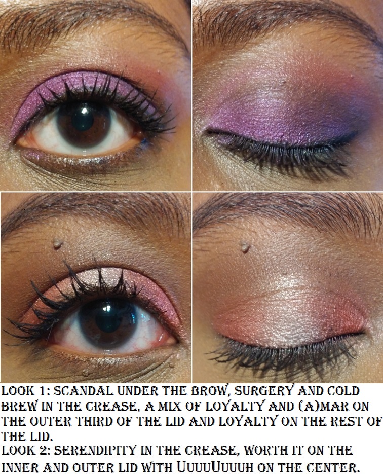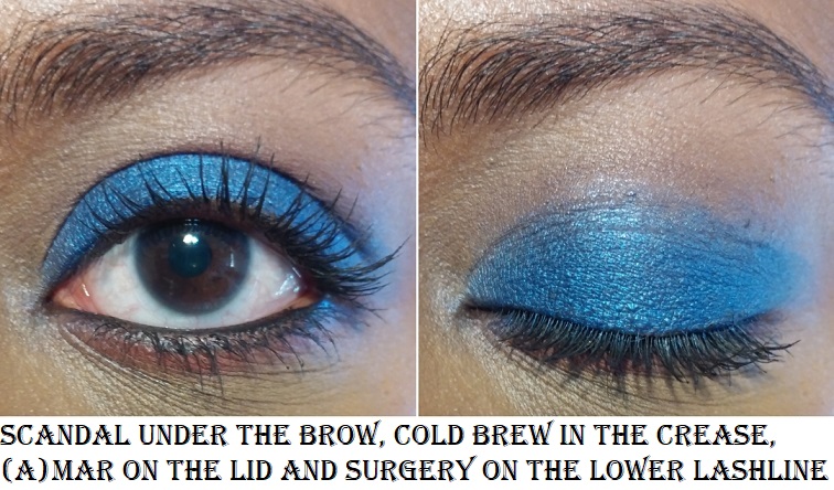 I love the fact that these shimmer shades make beautiful new colors when mixed together. For example, Fck Me Eyes and (A)mar create a pretty turquoise blue. Loyalty is a red-based purple but when combined with (A)mar is makes a nice deep cool purple. For a white shade, Scandal is not stark on my skin tone and I can actually use it in the crease. This is probably the only white shade in my entire eyeshadow collection that I like! The only color in the palette I dislike is Cold Brew, and that’s because it’s the same color as my hyperpigmentation. When I use it, it looks to me like I missed a spot or that the eyeshadow faded, but it’s just the color of the shadow.
