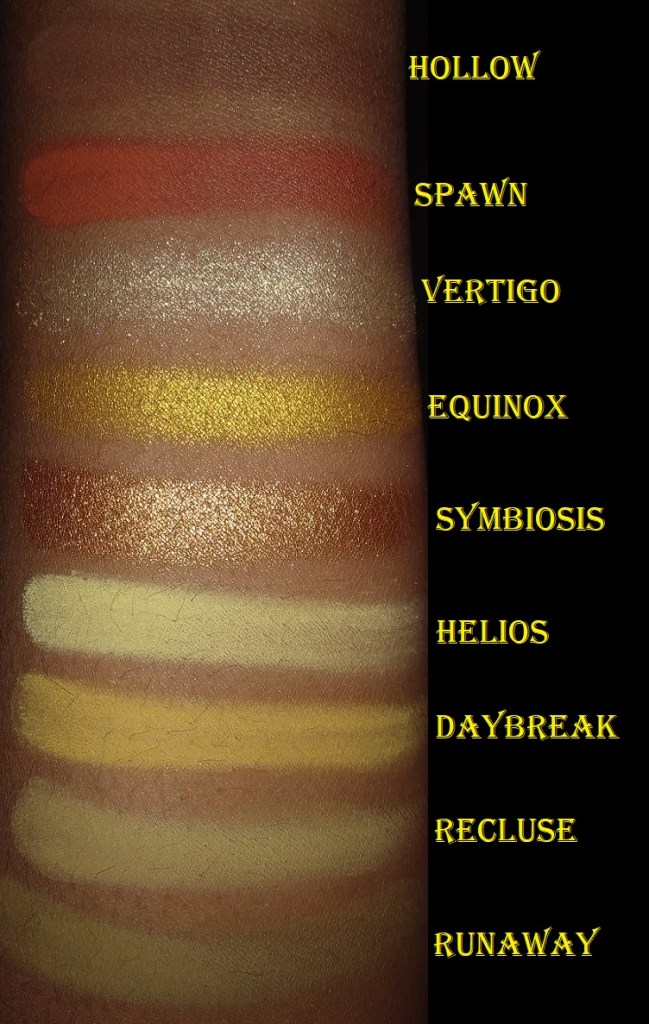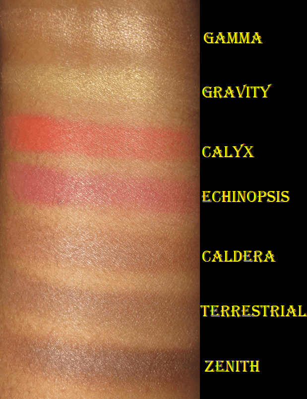 This is one of the four premade palettes on Lethal’s website. It was created for those with dark tan/olive to deep skin tones. Lethal Cosmetics has six individual highlighters that have been available long before the bronzers and blushes, but the highlighters in the premade palettes are exclusive to those palettes. The exclusive shade from Solstice is called Gravity and it has a strong yellow base. The blush included is called Echinopsis and the bronzer is Caldera.