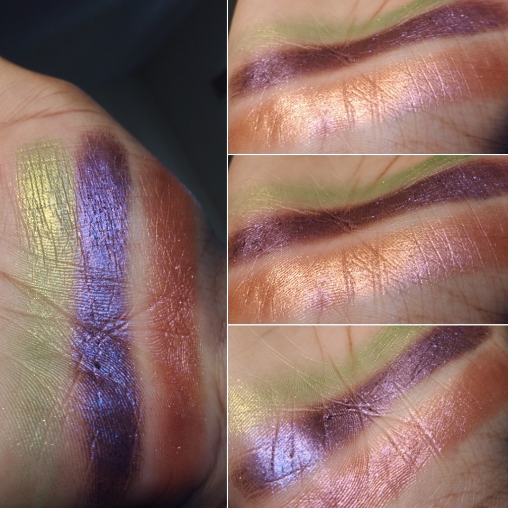 As for the triochromes Revolve and Covet, they do have a shift but they aren’t easy to see. With Clionadh, you can see a change on the fingertips, the pan, the eyelid, and/or arm swatch. Revolve is a shade I can slightly see on the finger in very specific angles but Covet is extremely difficult. I cannot see a change on either of them in arm swatches. I can faintly see a shift on the lid while wearing Revolve if I’m in the proper light. However, the only time I could capture anything from Covet was on my palm. I included a photo below, but to see a 3-second video clip you can click here. I was unable to figure out how to change the video dimensions to be smaller and embed it to a reasonable height and width on this page.