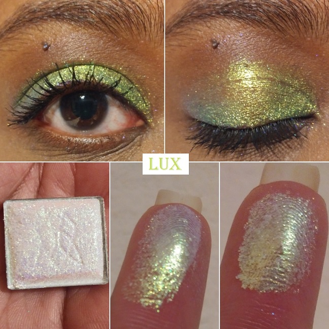 Lux has “colour shifting reflects that go from yellow-lime-turquoise-violet with a slightly more glittery finish.” This shade is so reflective and beautiful that I literally gasped when I first swatched it. My camera doesn’t come close to doing it justice!