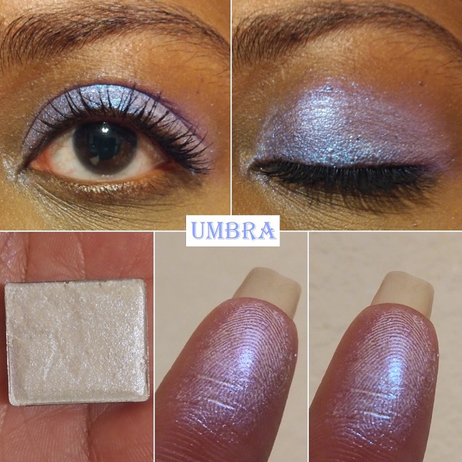 Umbra has “colour shifting reflects that go from blue-indigo-violet-pink.” This is the only one I have in this formula because although this kind of eyeshadow still works for me and is beautiful, it takes a bit of rubbing to make the white part of the powder disappear. It gets messy when I have to rub the shade rather than gently patting it onto my glitter-glue-primed eyes which I use to avoid fallout.