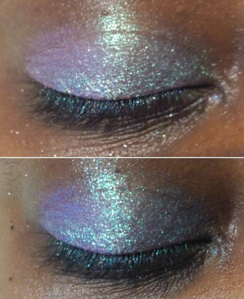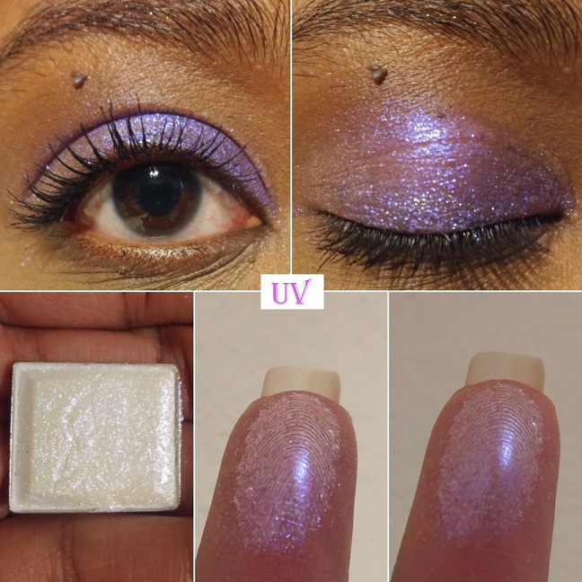 UV has “colour shifting reflects that go from violet-peach.” I can’t really see the peach on my skin tone but the shade of purple is beautiful and I’m happy with how it looks. It practically glows!