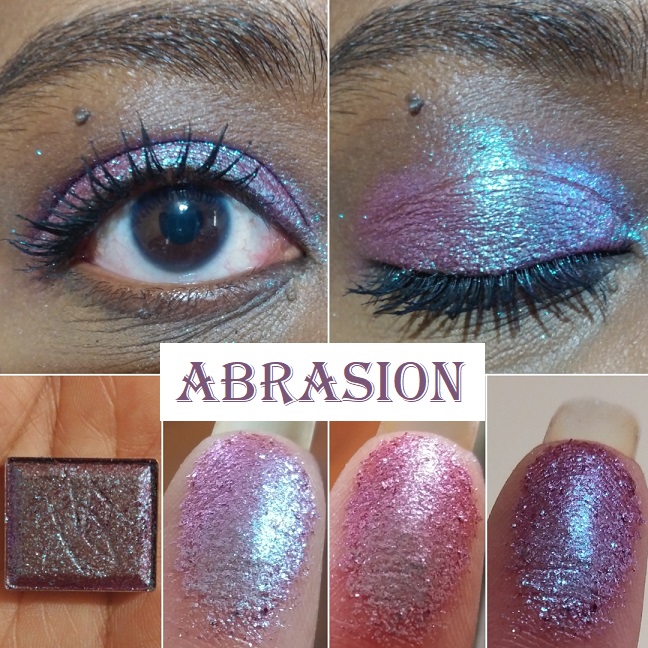 Abrasion “has a semi-sheer burgundy base with large glitter particles that shift turquoise-indigo-violet.” The color it looks in the pan is so similar to a multitude of duochromes I’ve seen before, even from mainstream brands, but when it’s actually swatched and put on the eyes, you can see how multi-dimensional it is. It’s so much more special than I thought!