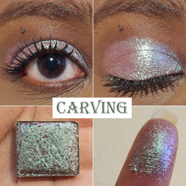 Carving “has a sheer, grungy, light brown base with medium/large glitter particles that shift turquoise-indigo-violet-pink.” I still haven’t decided if I like this shade or not. I’ve only worn it twice, so perhaps I’ll have a stronger opinion once I’ve worn it more. The pinkish turquoise gives it an interesting twist and I don’t recall having anything quite like it in my collection, though it gives me similar vibes to Grisaille and Abrasion.