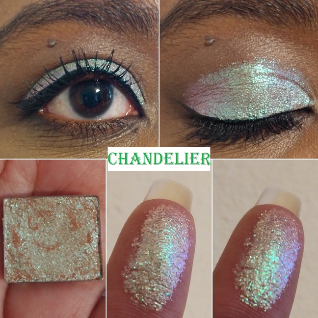 Chandelier has “a sheer pale mustard yellow base with small glitter particles that shift turquoise-indigo-violet-pink.” This shade surprised me. I typically don’t like shadows this light, but the shifts make this so wearable and flattering. It’s such a unique take on what could have been a typical goldish green, especially with how it looks so intensely turquoise at night. This is one of my favorites to wear alone or combined with other eye looks to give it extra oomph.