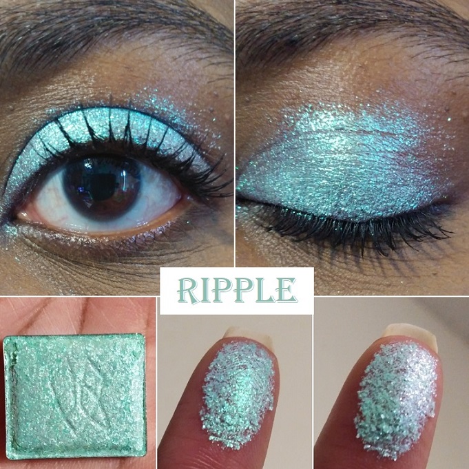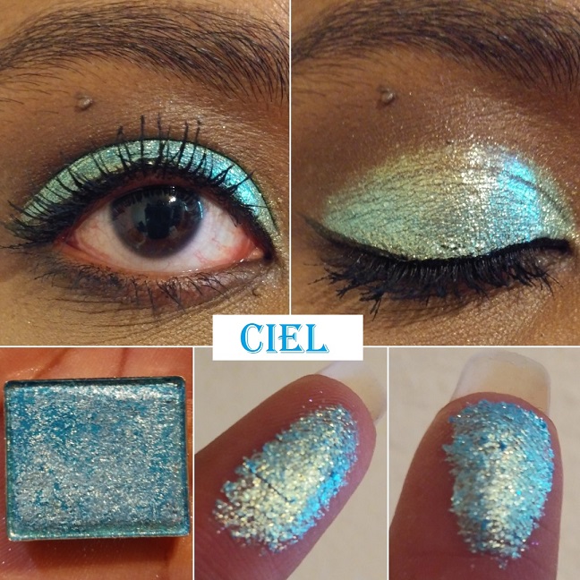 Ciel “has a semi-pigmented sky blue base with large glitter particles that shift gold-green-blue.” Ciel and Ripple aren’t typically the kind of blues that I like, but I thought if anyone could make me like this kind of color it would be Clionadh. Although it isn’t my favorite, I still use it from time to time. In the daytime, the lighter sky blue is more visible whereas, at night, it looks closer to the pan color.