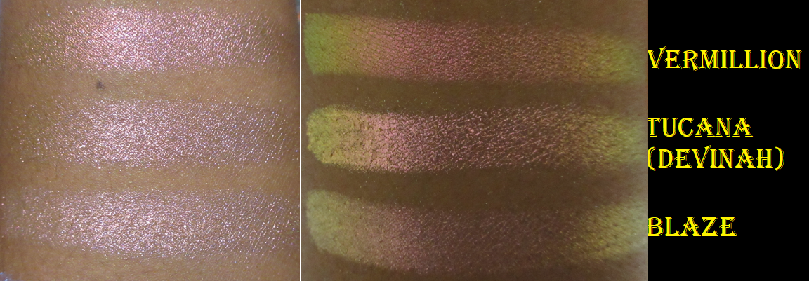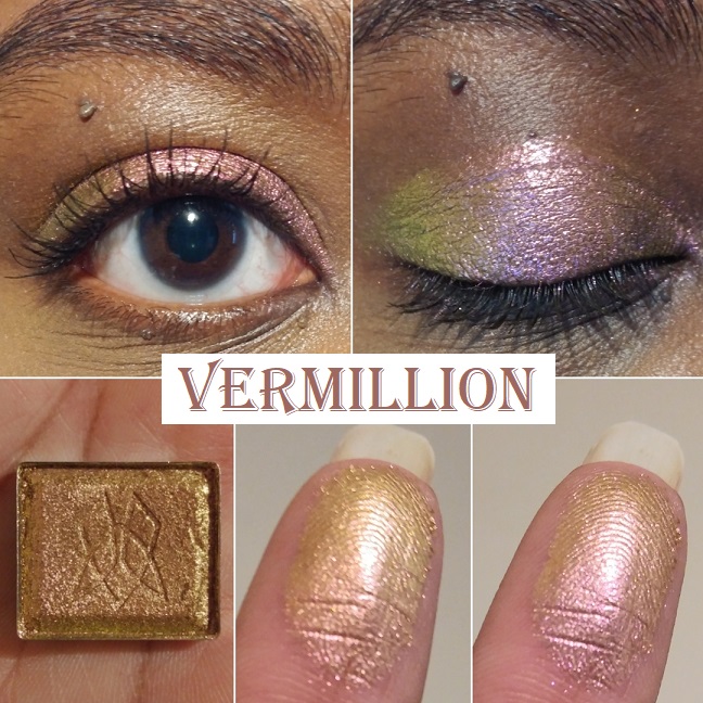 Vermillion has a “light, warm tan base that shifts pink-orange-gold-lime.” It’s not easy for me to be impressed by pink shades but this one is very pretty. It’s a smoother and shiftier version of Devinah’s Tocana.
