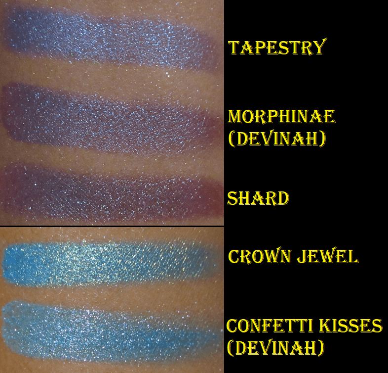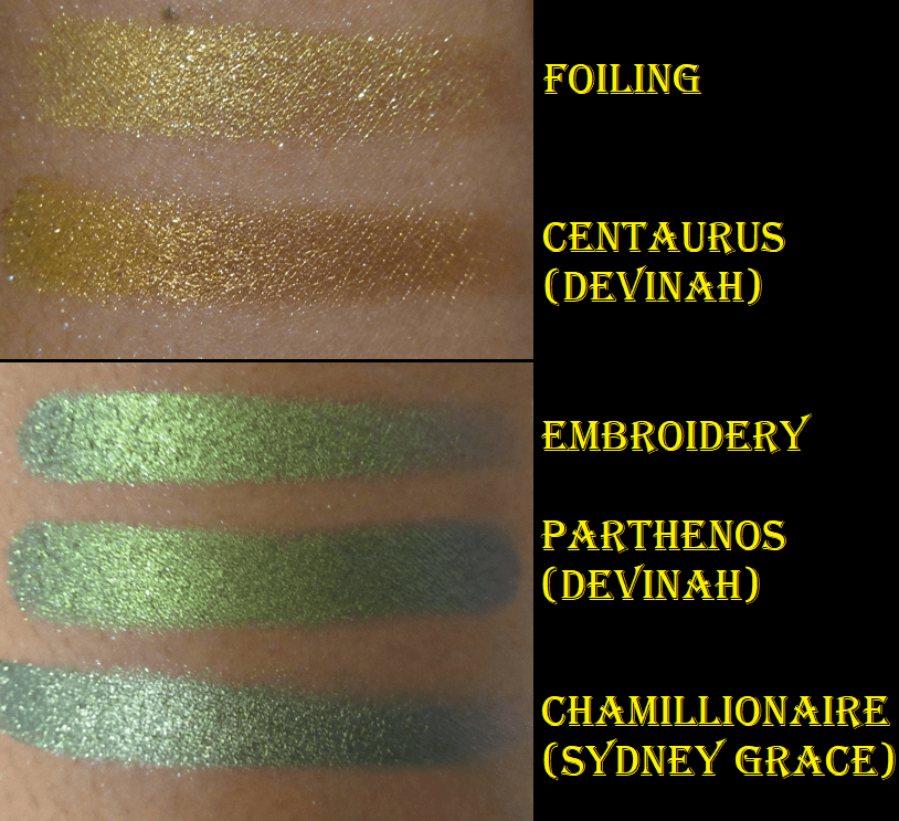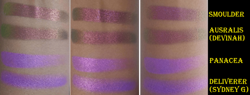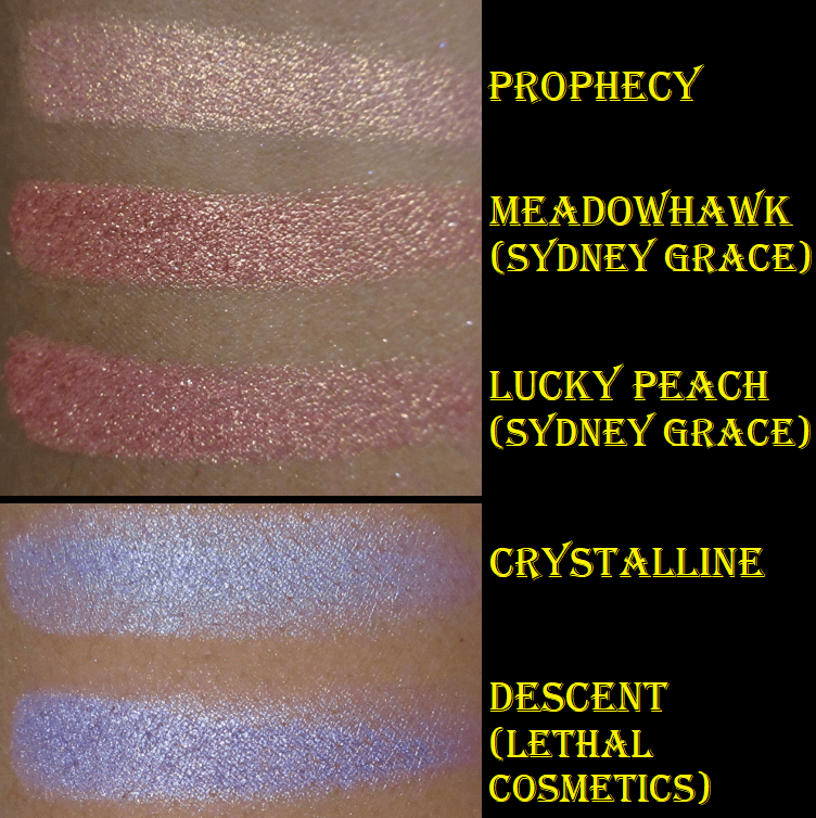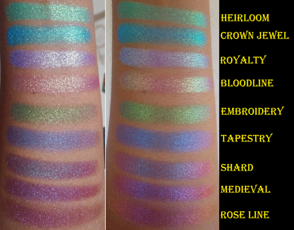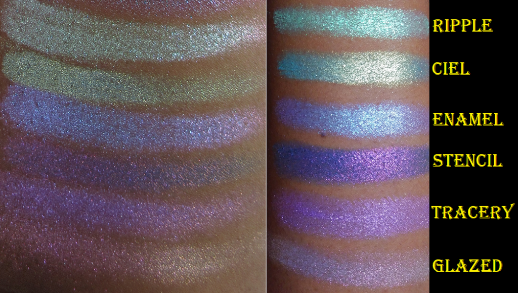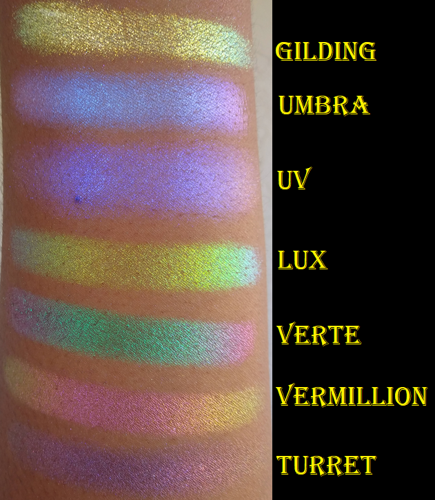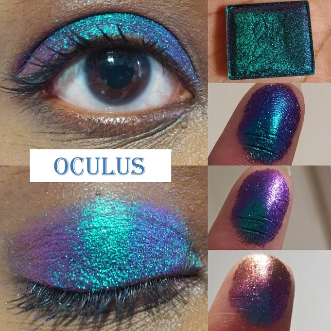 The hardest parts about comparing multichromes are that the shades in the pans don’t necessarily correlate to how they will look on the eyes, especially depending on the lighting. Sometimes they look similar based on one shift at one angle, or in the dark, or in bright light, or in the pan, or the types of colors that they shift to. Sometimes it’s only the base color that is similar.