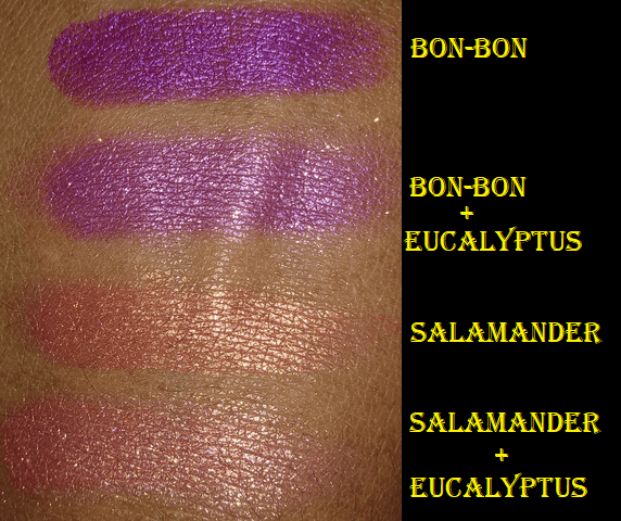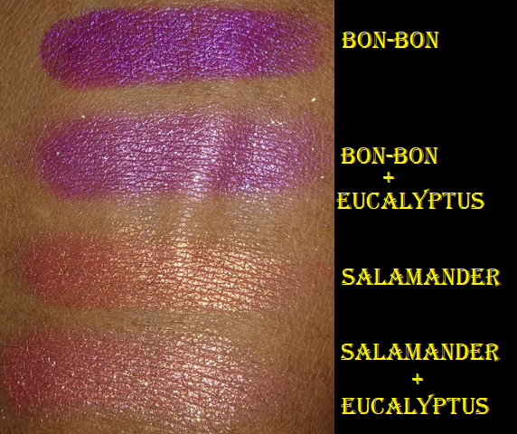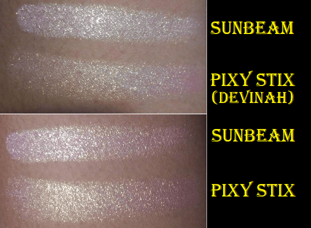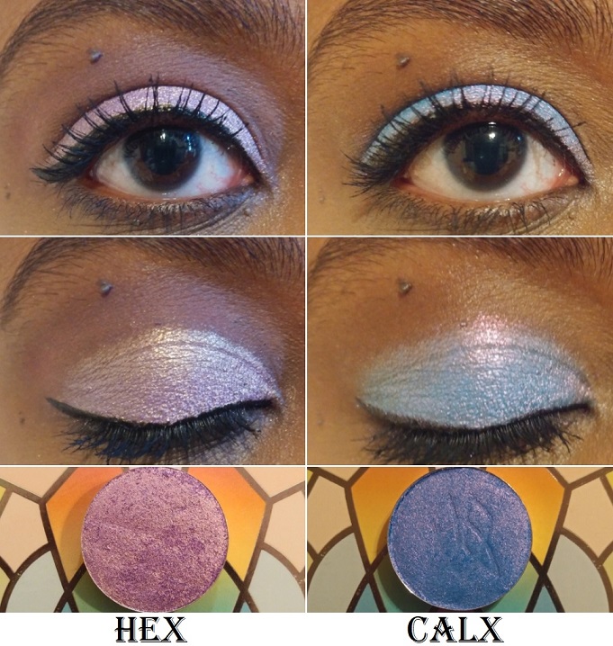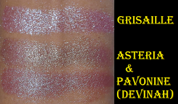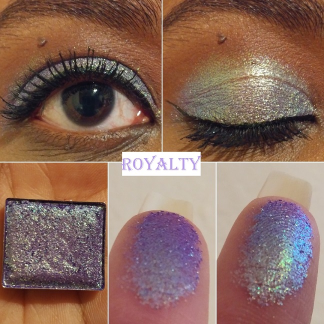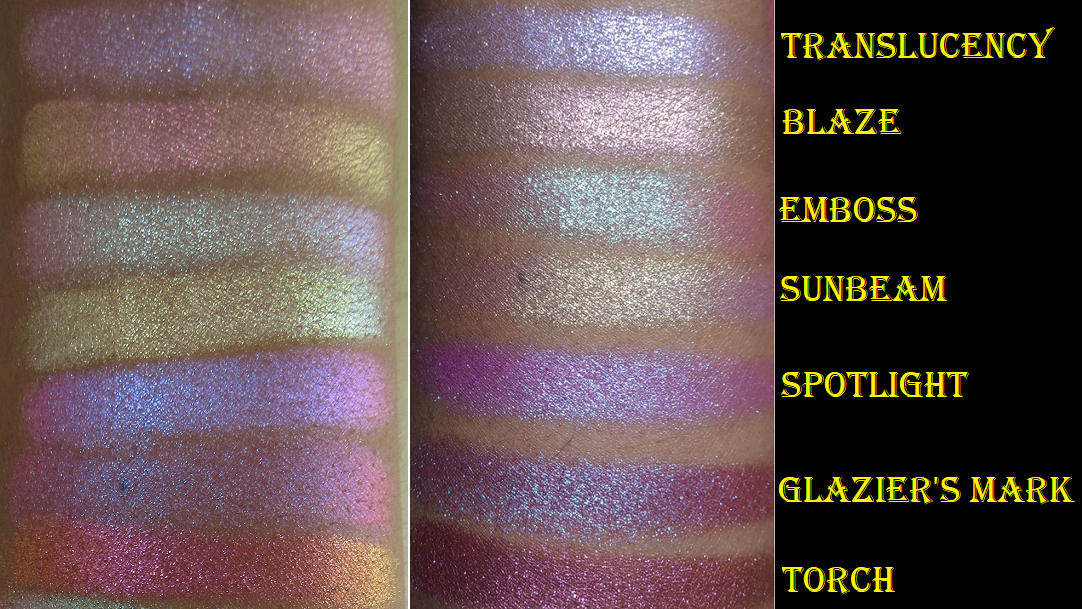 These appear white in the pan but have color shifts and a transparent base. They are recommended to be used as lid topper shades and highlighters for the eyes and face.