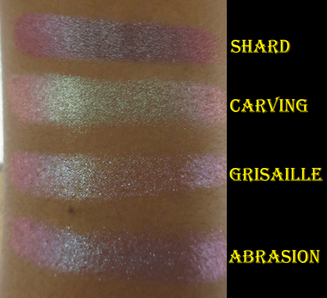 These “have a soft, sheer, grungy, grey base with bright, metallic coloured reflects.” They are a less intense version of the Jewelled multichromes. I like intense eyeshadows, so I honestly just bought one of the four in order to try out the formula in person to see what it was like for myself.