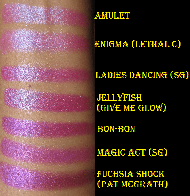 Amulet – from Team Witchcraft. This is a “a bright fuchsia that shifts blue.” This is a very popular type of duochrome shade. The base color is similar to Bon-Bon but Bon Bon is much deeper.