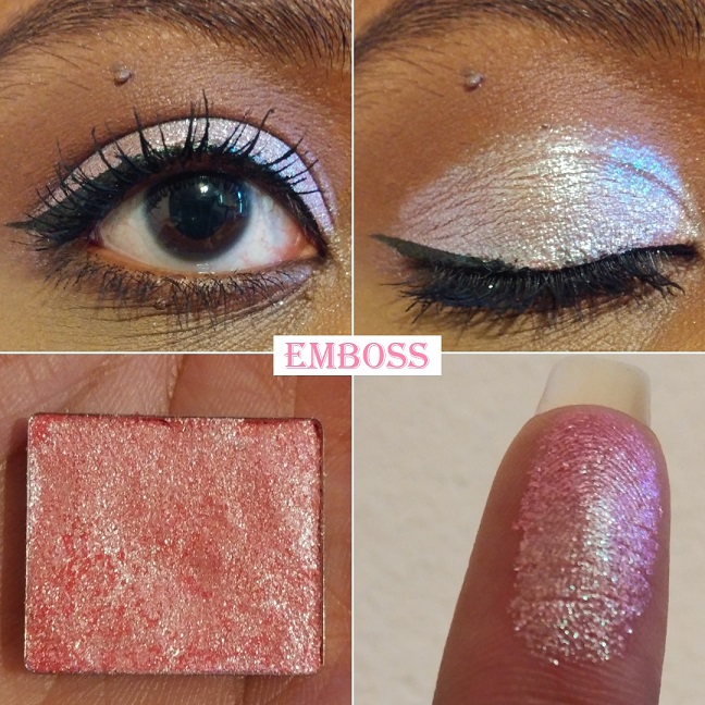 Emboss “has a semi-pigmented salmon base with small/medium glitter particles that shift lime-turquoise-blue.” On my eyelids, this looks a bit similar to how Carving and Sunbeam looked in regular daylight lighting. At night, I have an easier time seeing the lime and turquoise. I think I prefer Carving over Emboss, but I like Emboss more than Sunbeam.