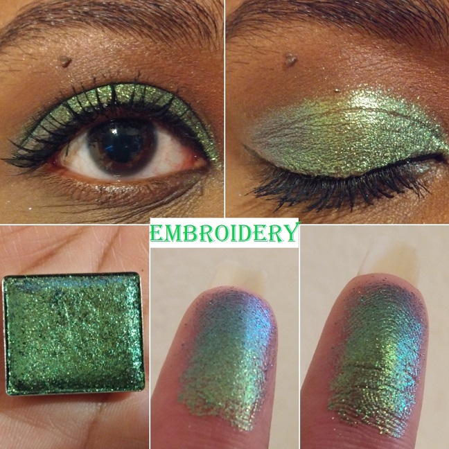 Embroidery “has a grey base with small/medium glitter particles that shift lime-blue-purple. The shift is very clear to see on my finger. On my eyes, it’s just a hint, but it’s such a beautiful color that I don’t mind. You can see just a tinge of blue on the outer corner of my eye in the lid picture.