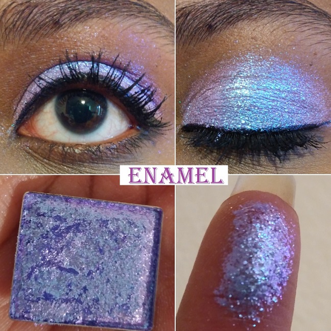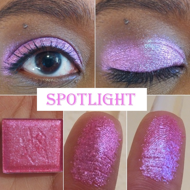Spotlight “has a semi-sheer hot pink base with medium/large glitter particles that shift blue-indigo-pink.” I didn’t buy this shade based on the color in the pan. It was entirely based on how it looked in swatches where the hot pink takes on more of a purple tone. It still isn’t as purple as I had expected it to turn but, it’s an interesting shade. It’s not my favorite but I don’t hate it.