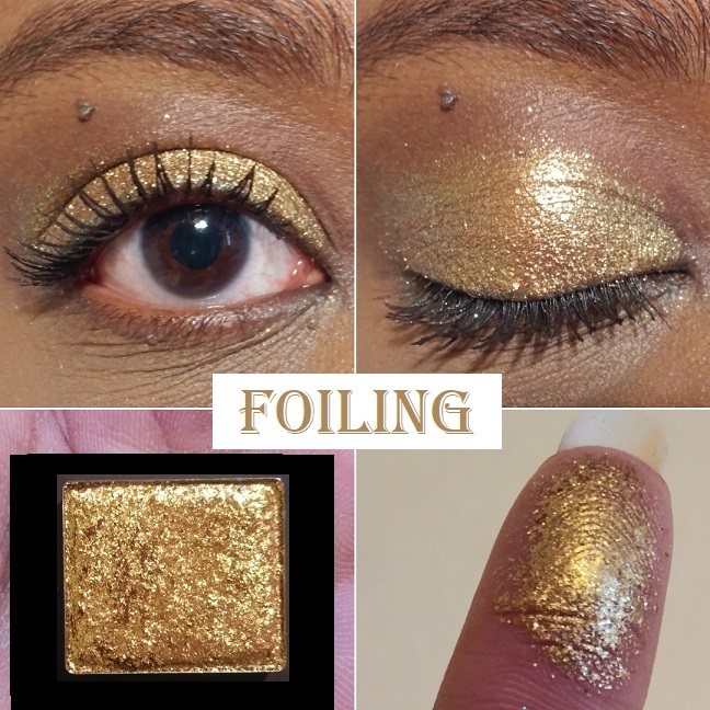 Foiling “has a pigmented warm gold base with medium/large glitter particles that shift orange-gold-lime.” This doesn’t show a shift easily. While outdoors, I can see the orange and gold, but still not the lime. I’m happy to have this because the glitter intensity and level of warmth in this gold shadow still make it stand out in my collection.