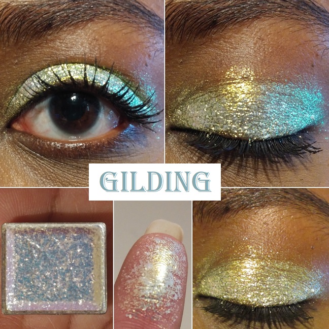 Gilding “has a translucent base that reflects bright gold-silver-green-turquoise.” The eyeshadows in this line are so incredibly beautiful, but because I prefer smaller sized glitter specks, this is the only one I intend to have in this formula. Also, I love how intense this is, but I wish the silver wasn’t there. On my complexion, the silver looks like unblended white powder in comparison to all the gold.