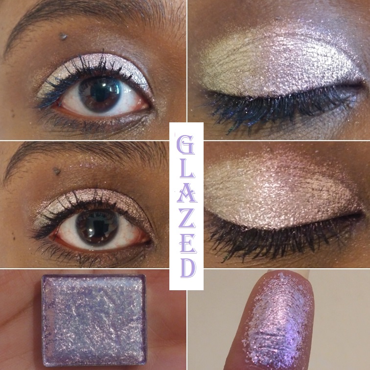 Glazed “Has a sheer lilac base with large glitter particles that shift pink-orange-gold.” I’ve learned that lighter purples are not my favorite and this pulls very white-gold/baby pink on me, which I also don’t like. Combine this with the larger glitter particles, and therefore added mess risk factor, and it becomes clear that this shade isn’t for me. Objectively speaking, it’s a pretty color though. On my eyelid, in this photo, it looks more strongly pink. At night, when the lighting shifts, the lilac is a bit more apparent and looks like the color on my finger.