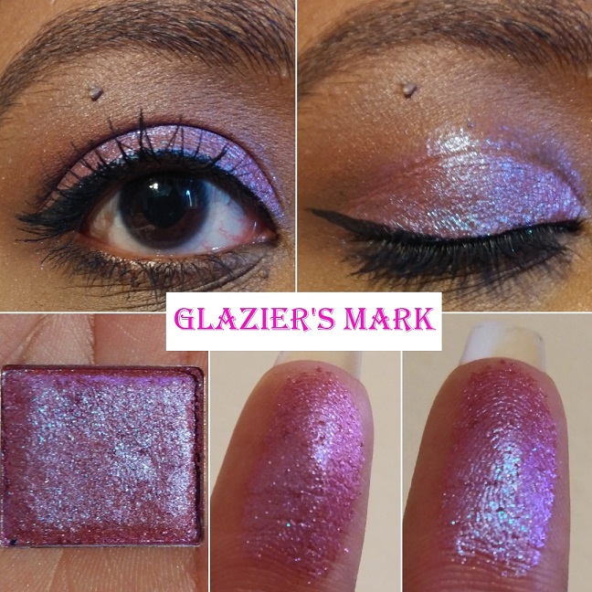 Glazier’s Mark “has a sheer orange base with medium glitter particles that shift indigo-violet-pink-orange.” My brain keeps saying I’ve seen shadows like this before, but everything I’ve tried to compare this to isn’t similar enough. On Temptalia’s blog, Enigma from Lethal Cosmetics and Magenta Dreams from Sydney Grace are some cited dupes that I also thought about based on the color in the pan. The way they look on my eyelids is where the biggest differences between them are seen and why I don’t think I have a close enough dupe. I think the choice to use an orange base, yet maintaining the magenta look, is what makes it a bit more unique.