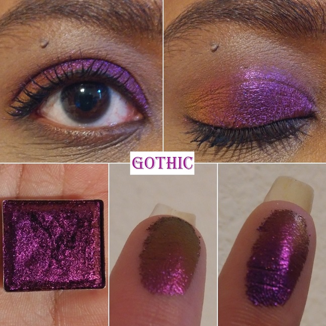 Gothic “shifts violet-pink-red-orange-gold.” This shade reminds me of an oil slick. It’s a beautiful warm purple and the shifts are very apparent in person. This isn’t a unique shade among multichromes, but from my research, this seems to be the best version of this color combo that anyone can buy.
