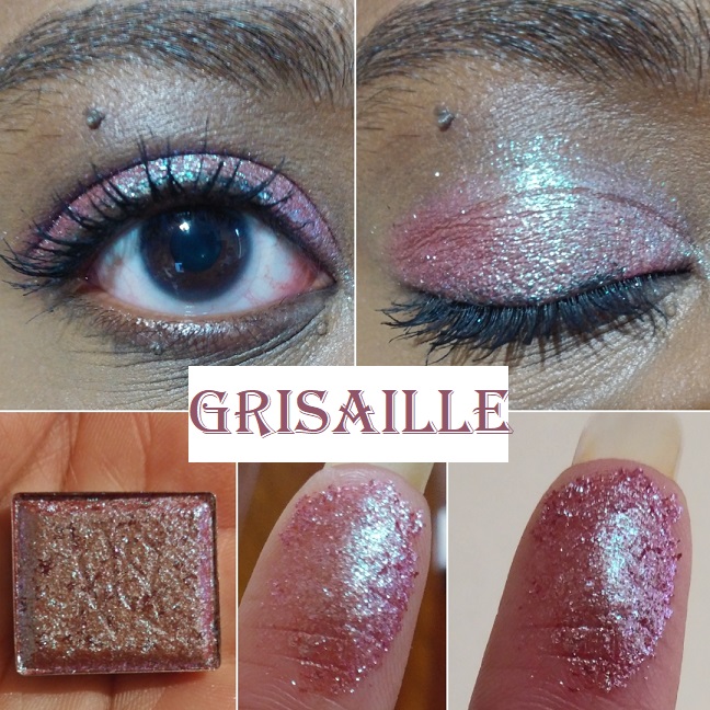 Grisaille “has a semi-pigmented terracotta base with medium glitter particles that shift turquoise-indigo-violet-pink.” This shade looked similar to Abrasion in the pan, but the base color changes the look on the eyes. Abrasion has a stronger turquoise shift whereas the sparkle in this appears more minty green, even though it isn’t described that way on the website. Pavonine from Devinah Cosmetics is a bit similar to this shade.
