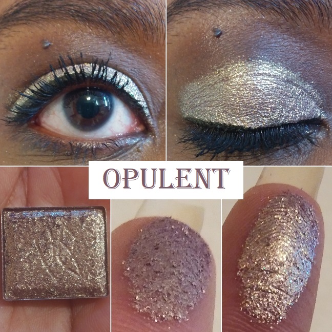 Opulent has “a warm purple-brown base (almost rose gold) with medium glitter particles that shift orange-gold-green-turquoise.” Certain shades don’t shift the way it is described, and I thought it might be due to my darkly pigmented eyelids, but I couldn’t see the other colors on my finger either. When I wear this one, it shifts from dark rose gold to a lighter and brighter gold, but that’s about all I can see. Perhaps the others show in different lighting. As it stands, the tone still makes it unique when seen in person.