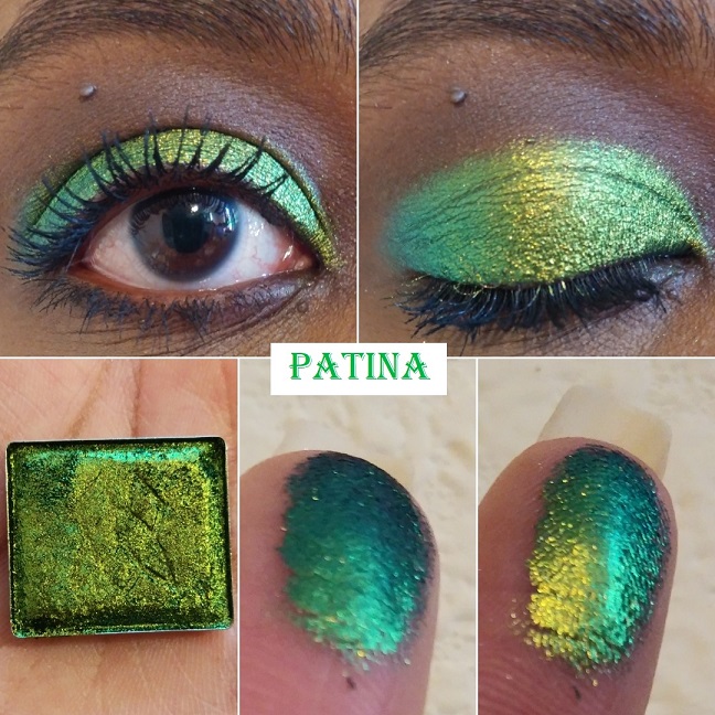 Patina “shifts gold-lime-emerald-turquoise.” There is no doubt that this green is striking. In fact, it’s a little intimidating. I still have yet to use Patina to its full potential because I’ve been drawn to the other greens in this collection. I would say that simple eye looks are better with intensely shifting multichromes because nothing should detract from the beauty of each shade on its own. However, I want to reserve Patina as the surprise pop to a look; to elevate a look that might be otherwise boring.
