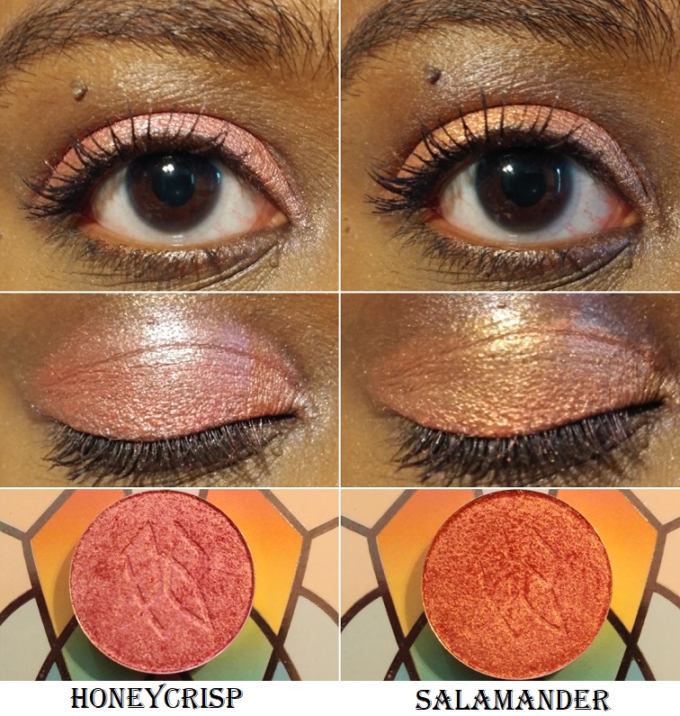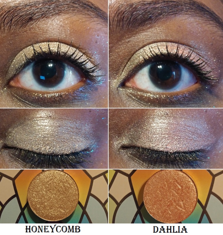 Dahlia – from the Woodlands Collection. It’s “a light peach-gold duochrome” that I thought would look a little more different on me than Honeycomb. Between the two, I think I like this shade slightly better for all over the lid because of the pinkish shift. As an inner corner shade, I would prefer a more neutral color like Honeycomb.